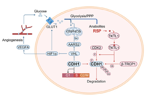 该研究首次发现,细胞周期调控因子CDH1不仅是细胞分裂的“守门人”,还通过协调代谢物的供给和信号感知,进而推动细胞周期的启动。研究揭示,CDH1一方面能够降解VHL并激活HIF1α,从而促进血管生成和外源葡萄糖摄取;另一方面,CDH1通过激活线粒体乳酰转移酶AARS2抑制氧化代谢,保存细胞增殖所需的合成代谢物,如核糖-5-磷酸(R5P)。而R5P能够作为关键信号分子,与转酮醇酶样蛋白TKTL1结合,进一步促进CDH1降解并启动新一轮细胞周期。