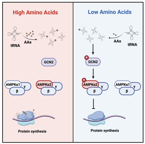 研究发现,AMPK的催化亚基α存在两种高度相似的亚型——α1与α2。在氨基酸缺乏的情况下,经典的氨基酸感知蛋白GCN2能够特异性结合并磷酸化α2亚基,通过α2-eEF2K-eEF2通路传递低氨基酸信号,从而关闭蛋白质合成,保护机体氨基酸储备。而α2的失调会导致蛋白质合成的异常激活,并在动物模型中驱动记忆衰退、认知障碍等阿尔茨海默症(Alzheimer’s Disease, AD)相关表型的出现。AMPK激活剂或低氨基酸/低蛋白质饮食能够依赖α2发挥保护作用,显著改善AD症状。