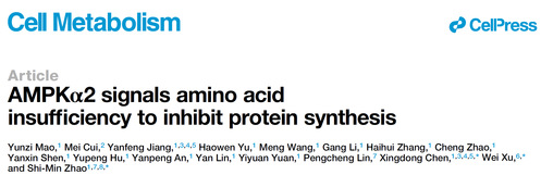 赵世民教授、徐薇研究员联合复旦大学人类表型组研究院陈兴栋研究员团队在国际代谢顶级期刊《Cell Metabolism》杂志(IF:30.9)合作发表了题为“AMPKα2 Signals Amino Acid Insufficiency to Inhibit Protein Synthesis”的研究成果。该研究首次揭示,AMPKα2能够作为大脑“氨基酸丰度的感应器”,通过抑制蛋白质过度合成。